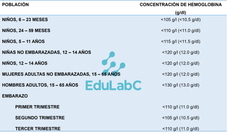 Los puntos de corte para definir la anemia han mostrado cierta heterogeneidad según la bibliografía que se consulte. Es así como a organización mundial de la salud a emitido puntos de corte según el sexo y grupo de edad con el fin de aplicar un enfoque estandarizado.