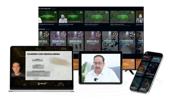 Encontrarás minicursos, materiales descargables, resúmenes, clases online, eventos exclusivos y contenidos nuevos cada mes, enfocados en distintas áreas del laboratorio clínico como química clínica, hematología, uroanálisis, microbiología y más.